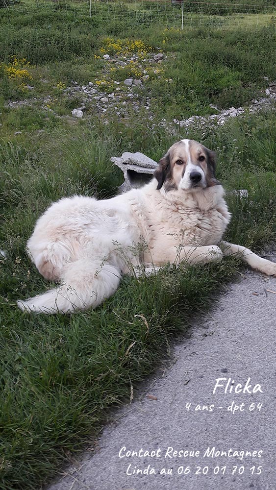 Flicka est une femelle type montagne des Pyrénées de 4 ans (née le 15 août 2013), elle est identifiée (250268711063830) et à jour de ses vaccins. C’est une chienne de protection qui n’assure pas son travail avec les brebis et quitte le troupeau. Elle cherche donc un nouvel environnement pour s’épanouir.